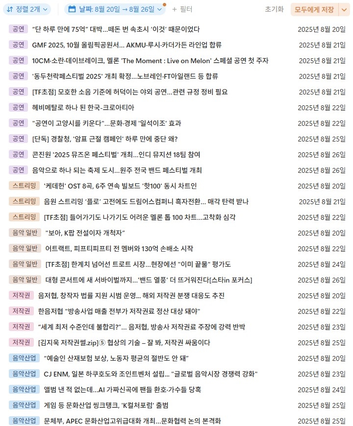 2025년 8월 4주(35주차) 음악산업동향 및 공모 공고 리스트를 열람하실 수 있습니다.