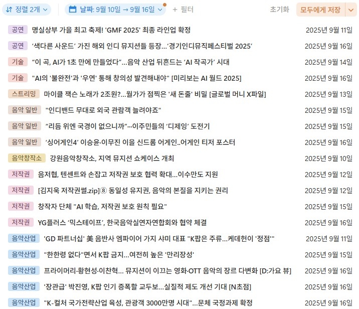 2025년 9월 3주(38주차) 음악산업동향 및 공모 공고 리스트를 열람하실 수 있습니다.