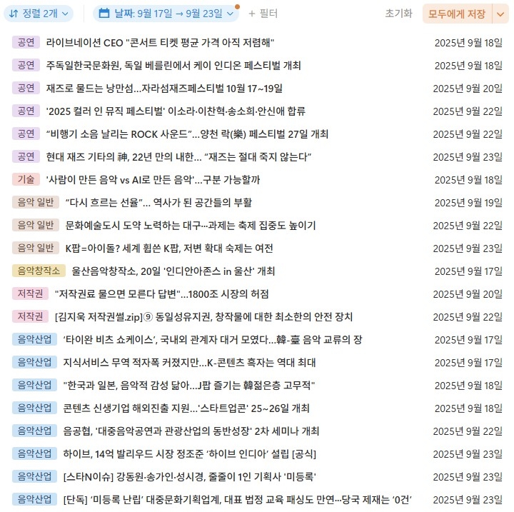 2025년 9월 4주(39주차) 음악산업동향 및 공모 공고 리스트를 열람하실 수 있습니다.
