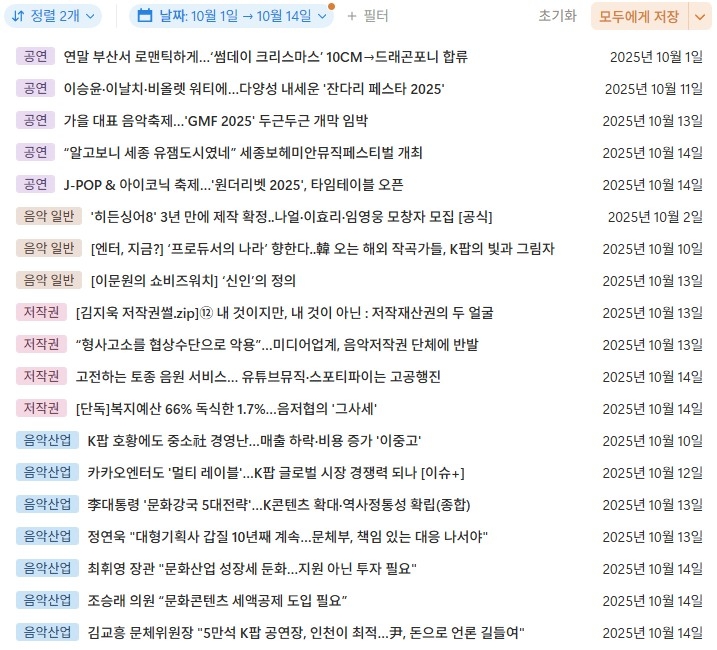2025년 10월 3주(42주차) 음악산업동향 및 공모 공고 리스트를 열람하실 수 있습니다.