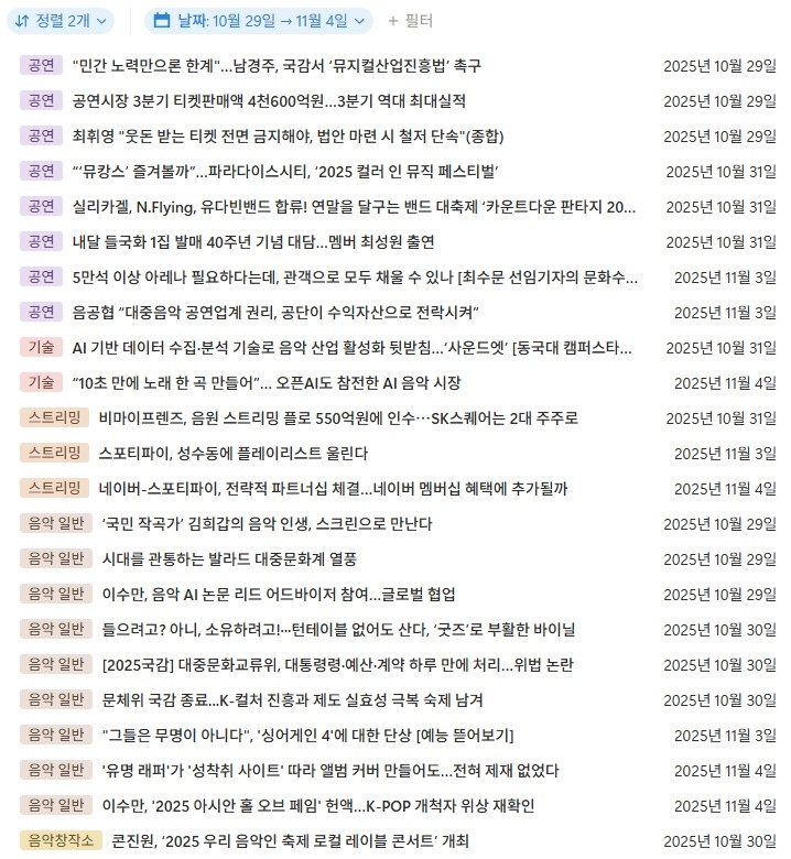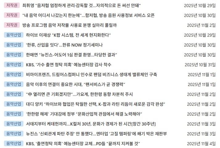 2025년 11월 1주(45주차) 음악산업동향 및 공모 공고 리스트를 열람하실 수 있습니다.