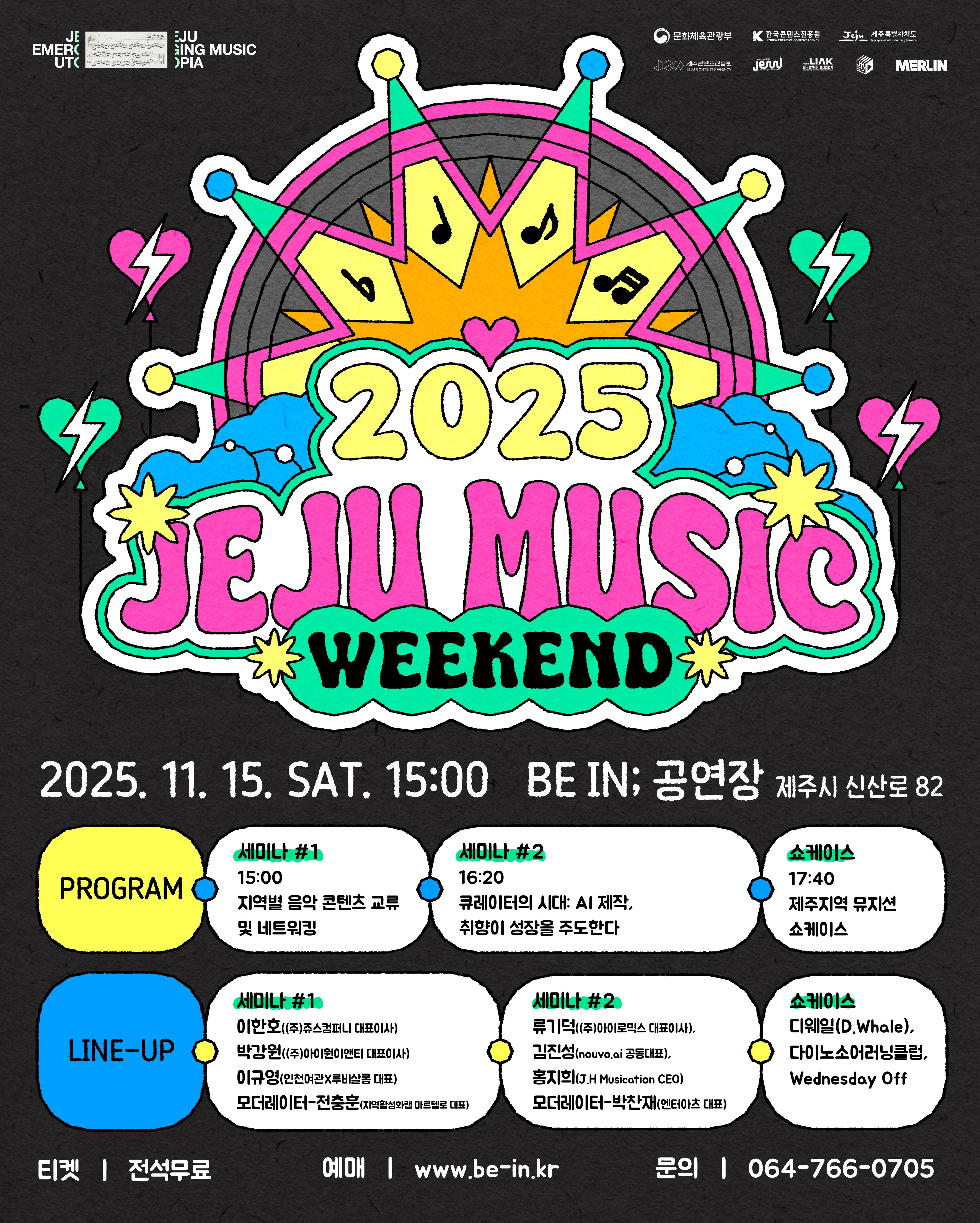 제주특별자치도와 제주콘텐츠진흥원, 한국음악레이블산업협회가 함께하는 ‘2025 제주뮤직위켄드’가 오는 11월 15일(토) Be IN; 공연장에서 개최됩니다!