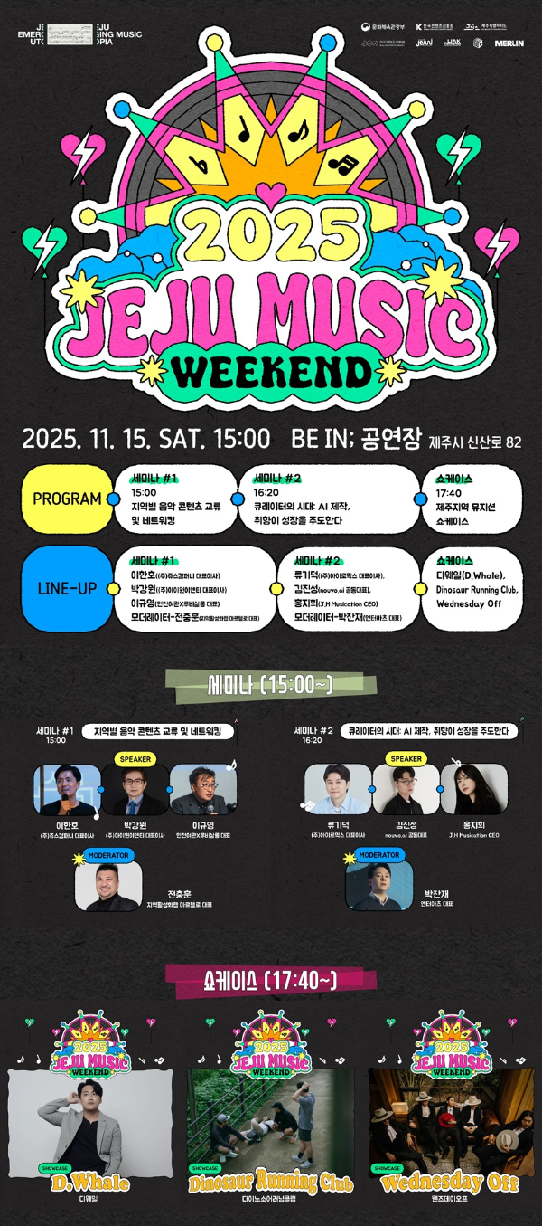 세미나 이후에는 제주음악창작소 ‘음반 제작지원 프로그램’에 선정된 뮤지션 디웨일(D.Whale), 다이노소어 러닝 클럽(Dinosaur Running Club), 웬즈데이 오프(Wednesday Off)의 쇼케이스가 이어진다. 제주의 개성과 감성을 담은 세 팀의 무대는 음악을 통해 지역 창작이 산업으로 확장되는 과정을 보여줄 예정이다.